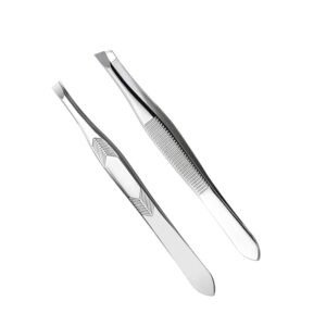 This professional set includes Slant Tip and Flat Tip tweezers for versatile grooming, from brow shaping to ingrown hair removal. Both are crafted from High Carbon Steel for durability and precise, secure grip without hair breakage.